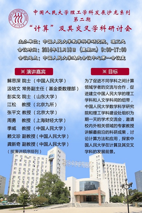目标:为了促进不同学科之间计算领域学者的交流与合作, 促进建立人民大学理工科和人文学科的纽带,人民大学理工学科建设处和数学科学研究院组织为期一天的学术交流会,邀请校内外相关领域的专家教授讲解最前沿的科研成果,讨论计算方法和应用,探索人民大学在计算及其交叉学科的发展前景。