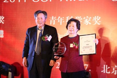 学会理事长李国杰院士向2011 CCF杰出贡献奖获得者王珊教授颁奖
