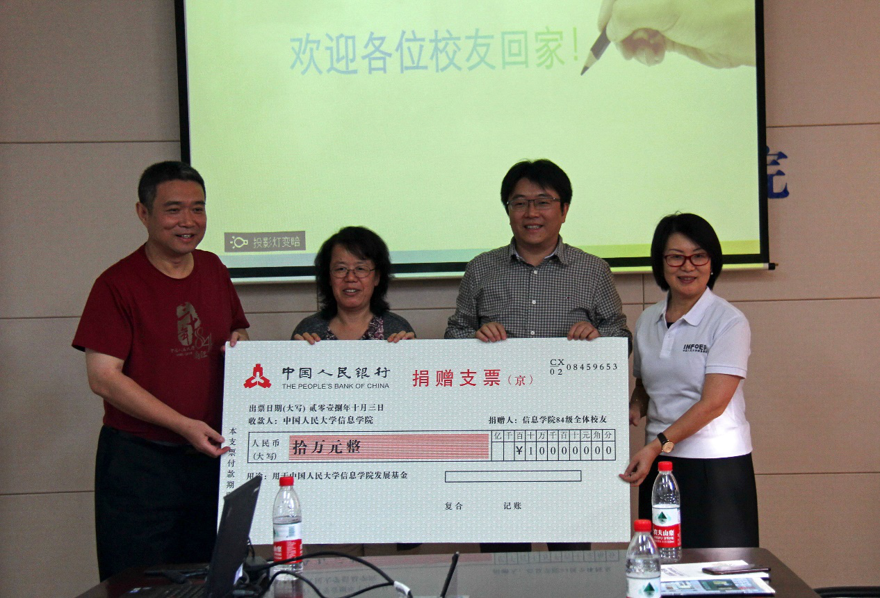 为表达对葡京娱乐场官方网站 的感激之情,84级全体校友捐赠10万元至葡京娱乐场官方网站 发展基金,文继荣院长与陈红老师代表全院师生向84级校友表示感谢。