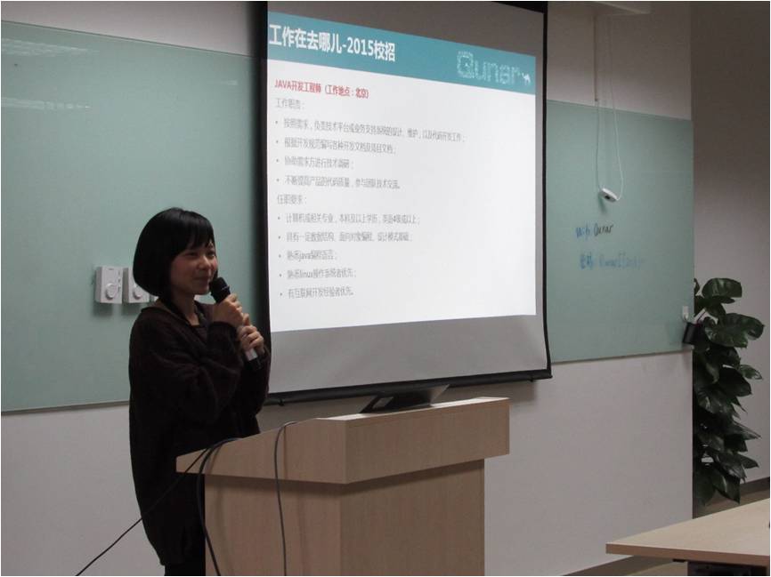 随后,去哪儿网的人事、产品等部门的主管详细介绍了去哪儿网的基本情况与运营模式,并与大家展开了热烈的交流。最后他们展示了公司2015年校招的大致情况,鼓励同学们成为去哪儿网的一份子,为公司注入新的血液。