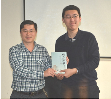 (图说:张国富老师向刘泽豪赠送信息校友访谈录——《信息骄子》一书)