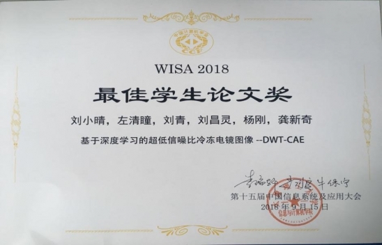 近日,葡京娱乐场官方网站 生物信息学与机器学习实验室的研究成果被第十五届全国Web信息系统及其应用学术会议(WISA2018)接收并受邀做论文报告,论文“基于深度学习的超低信噪比冷冻电镜图像—DWT-CAE”(作者:刘小晴、左清瞳、刘青、刘昌灵、杨刚、龚新奇)被评选为唯一的中文最佳学生论文。