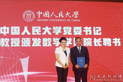 靳诺为国家杰出青年科学基金获得者郑志勇教授颁发聘书,郑志勇受聘为中国人民大学数学葡京娱乐场官方网站 首任院长。