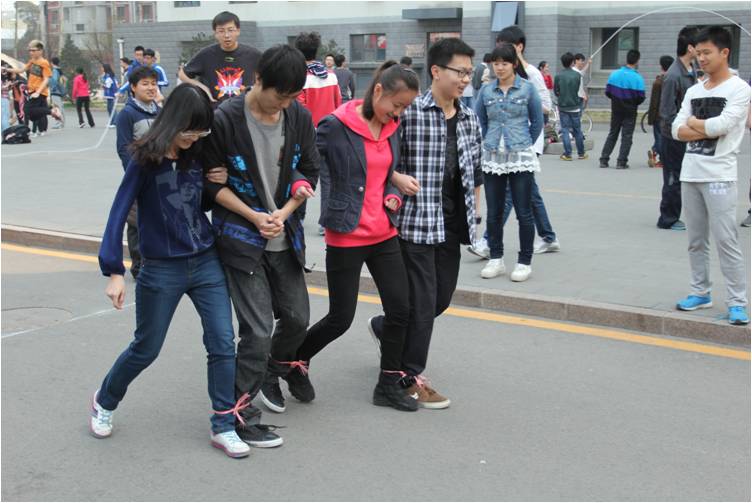 在跳大绳比赛进行的同时,另一边的四人五足比赛也正如火如荼的上演。每班需选出8人参加比赛,4人一组分成两组,每组至少两个女生。每组需前行25米,用时最短的班获胜,每班取两组成绩中最好的一组。起初,参赛的同学并不默契,步子不够协调,但经过一段时间的练习,在选择了最佳姿势和口号之后,个别组的同学已经非常熟练,飞奔到终点。也有一些组的同学仍然在摔跤。比赛过程笑声不断。最终13级五班以6秒4的成绩获得13级第一名,四班和一班获得第二、第三名。12级六班以8秒成绩获得12级第一名,三班和五班获得第二、第三名。