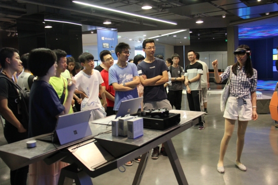 同学们在一楼访客中心进行参观。通过工作人员的讲解,同学们对微软的研究成果,如人脸识别、world of windows、智能翻译、无人机面部扫描拍照、全息眼镜HoloLens、微软云、未来家居、智能厨房等有了深入了解,并在工作人员指导下亲身体验各种高科技产品。