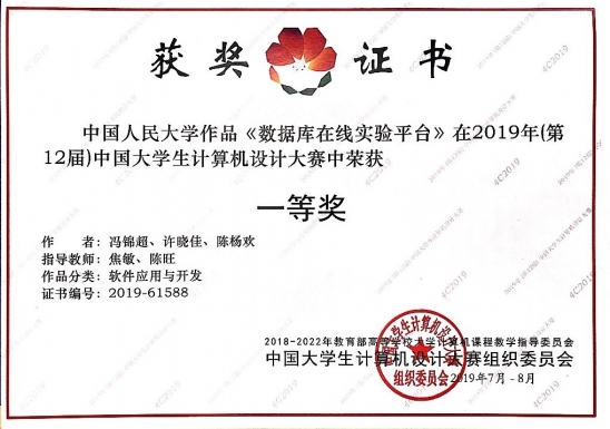 8月的芜湖闷热潮湿,且赛期正赶上今年最强台风“利奇马”来袭。然而,这都挡不住葡京娱乐场官方网站 参赛师生的拼搏精神。经过激烈角逐,焦敏老师、陈旺老师指导2016级本科生冯锦超、许晓佳和2017级本科生陈杨欢设计的“数据库在线实验平台”荣获全国一等奖(前1%);武文娟老师、刘永刚老师指导2016级本科生袁江风、杜昊昱、聂江磊设计的“通用教学管理系统”荣获全国三等奖。