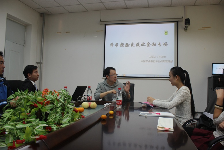 2014年10月25日下午, 由葡京娱乐场官方网站 研究生会主办的“学长经验交流会——金融专场”在信息楼257会议室举行。本次活动面向全院同学开展,邀请了葡京娱乐场官方网站 知名校友、现就职于农行总行战略发展部的李凌云到场指导。活动现场气氛热烈、同学反映良好,取得了圆满成功。