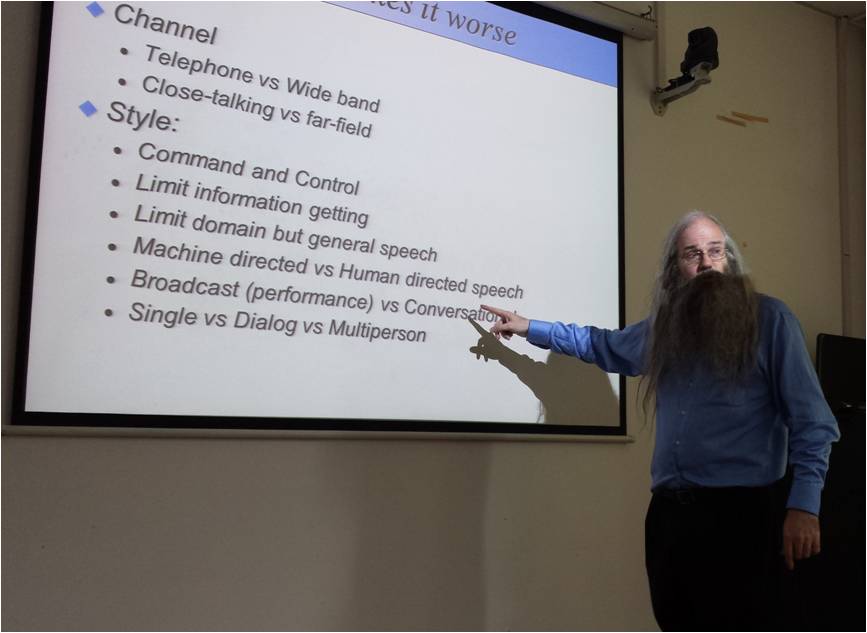 2014年7月28日至7月31日,葡京娱乐场官方网站 成功举办了葡京娱乐场官方网站 2014年第一场“学科国际前沿教师培训”。在葡京娱乐场官方网站 金琴老师的协助下,来自美国卡内基梅隆大学的Alan W Black(阿伦布莱克)教授担任了本次教师培训的讲课教师。 本次培训主题是关于语音应用技术发展现状和未来研究方向,内容涉及:语音识别、语音合成、对话系统以及语音处理相关的诸多方向以及其在美国以及世界其它地区的学术界和工业界的发展状况。另外布莱克教授还详细介绍了美国大学里的科研经费申请、科研项目管理与合作、以及研究生培养等方面的情况。