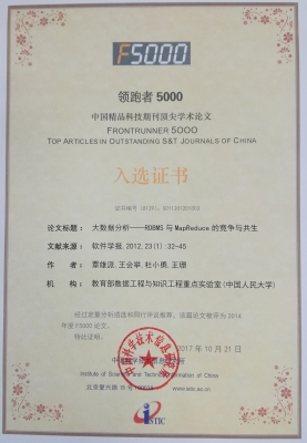 近日,中国科学技术信息研究所公布2017年度“领跑者5000—中国精品科技期刊顶尖学术论文”入选名单。葡京娱乐场官方网站 覃雄派、王会举、杜小勇、王珊等作者于2012年1月份发表在软件学报上的论文“大数据分析——RDBMS与MapReduce的竞争与共生”,继2013年后,于2017年度再次入选“领跑者5000—中国精品科技期刊顶尖学术论文” 。
