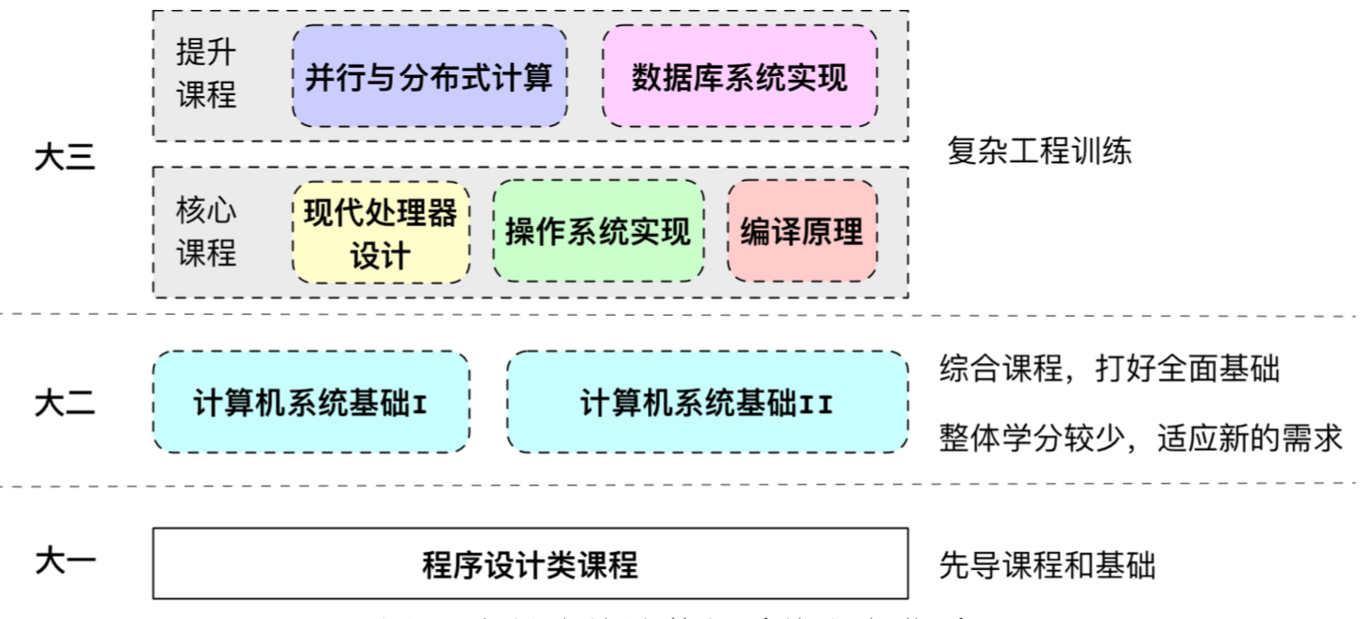 如下图所示,在大二开始的《计算机系统基础》I和II两门课程综合了传统多门计算机系统类课程的教学内容,拉通计算机软硬件之间的关系,让学生对计算机系统建立整体的认识,打好全面的基础。在《计算机系统基础》课程之上,大三设置了多门复杂工程训练的课程,包括《现代处理器设计》、《操作系统实现》、《编译原理》、《并行与分布式计算》和《数据库系统实现》,大类培养中各个专业根据专业需求和人才培养的侧重点从中选择适当的课程。