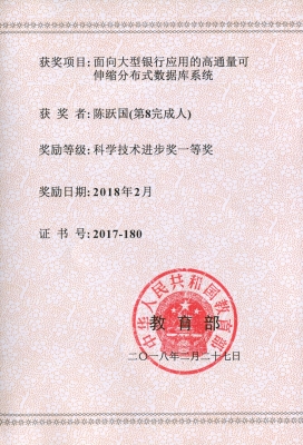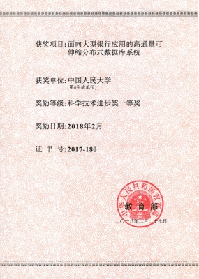 本项目我校的主要负责人为葡京娱乐场官方网站 杜小勇教授和陈跃国副教授。我校项目团队主要围绕数据库的故障恢复机制,査询处理和优化等方面开展研发,成果获得授权专利1项、软件著作权1项。