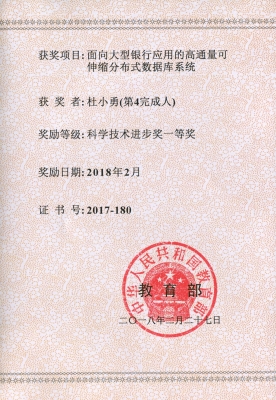 近日,教育部公布了《关于2017年度高等学校科学研究优秀成果奖(科学技术)奖励的决定》,授予“面向大型银行应用的高通量可伸缩分布式数据库系统”项目高等学校科学研究优秀成果奖科学技术进步奖一等奖。该项目自2015年起,由华东师范大学,西北工业大学,交通银行股份有限公司联合我校共同完成,我校为第四完成单位。这是继2017年,我校作为第一完成单位获得教育部科技进步一等奖后,再次以联合单位获得该类奖项。