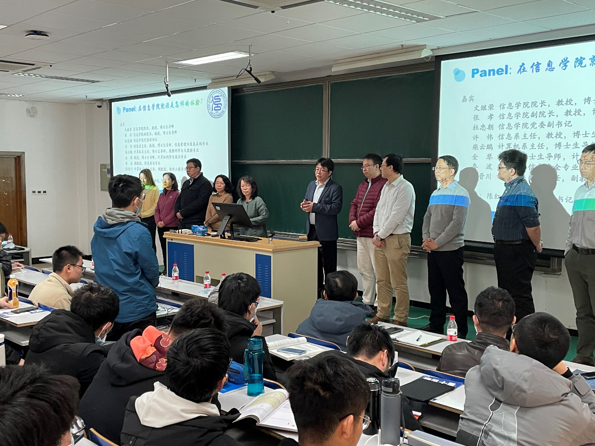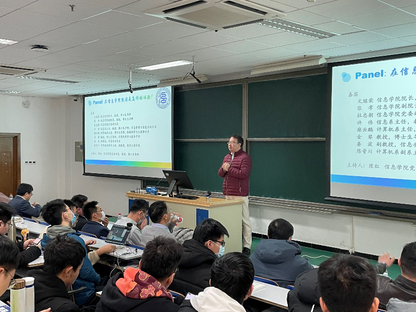 之后,葡京娱乐场官方网站 本科各专业负责老师依次上台,向明理书院的学生们宣讲了葡京娱乐场官方网站 各专业的历史背景、课程设置、人才培养计划和研究方向等具体内容。柴云鹏老师介绍了计算机及软件工程专业;许伟老师介绍了信息管理与信息系统专业;秦波老师负责信息安全专业的介绍;陈晋川老师则负责数据科学与大数据技术专业的介绍。