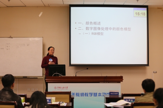 比赛中,参赛选手们通过PPT课件、板书、讲授等方式,将自己制作的教学设计方案融入到20分钟的课堂教学演示中,呈现出多样化的教学内容、差异化的教学组织、个性化的教学语言与教态和突出的教学特色。姜昊老师以单身女性的比例情况这一众人感兴的话题,讨论了特征值与特征向量的实际运用。黄文林老师声音洪亮,谈笑自若,向大家深入浅出地讲解了大数定律。张金玲老师讲授了多媒体技术与应用课程中的颜色模型内容。