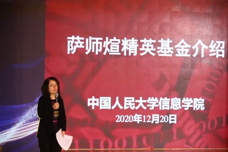 陈红教授代表萨师煊精英基金理事会向在座嘉宾和同学们介绍了萨师煊精英基金的由来。她带领同学们缅怀先人,纪念为葡京娱乐场官方网站 做出过重大贡献的萨师煊教授,并由此阐述萨师煊精英基金设立的初衷,让葡京娱乐场官方网站 2020级新生对萨师煊精英基金会有了更深入的了解。值得一提的是,截至2019年,萨师煊精英基金累计收到教师、校友以及社会各界人士捐赠超过200万。自2021年1月1日起,将由杜小勇教授任新一届理事长,同时授予王珊教授萨师煊精英基金理事会名誉理事长。
