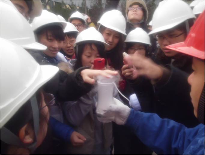 在集中介绍会之后,同学们带上安全帽,深入厂区,对电厂的脱碳设备和发电机组控制室作了实地参观。首先大家围绕厂区进行参观,对厂区的规模与构建有了初步印象,之后同学们参观了厂区内的煤棚和脱碳设备,对厂区设备进行深入了解。在参观过程中,同学们对华能电厂新运用的脱碳设备尤其感兴趣,并且争相体验了用制取出的固态二氧化碳进行升华的实验。同学们在参观发电机组中控室的过程中不仅了解了机组相应的发电原理和控制设备的工作机制,同时也提出了很多自己感兴趣的问题,工程师耐心地对这些问题给出了相应的解答。参观活动结束后,全体师生在厂区中心广场合影留念。