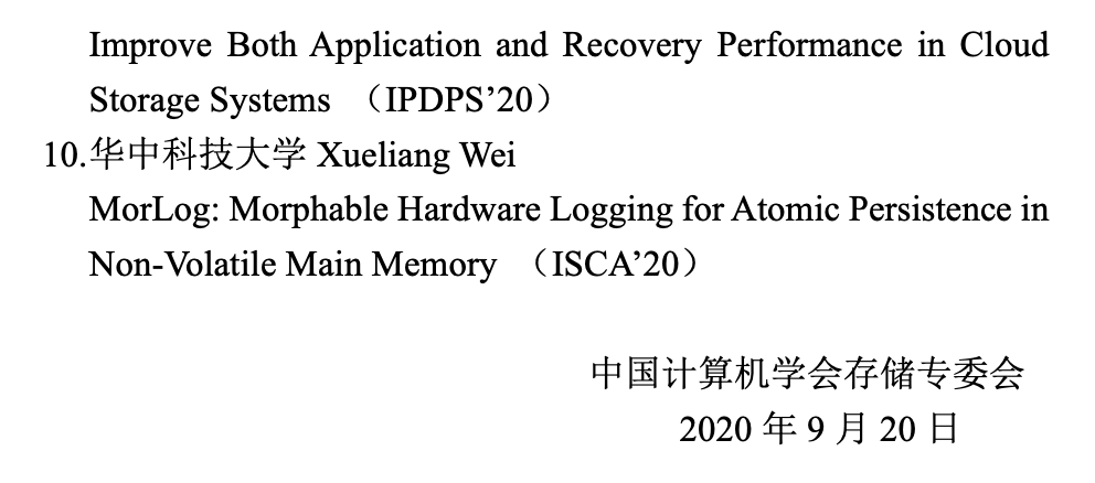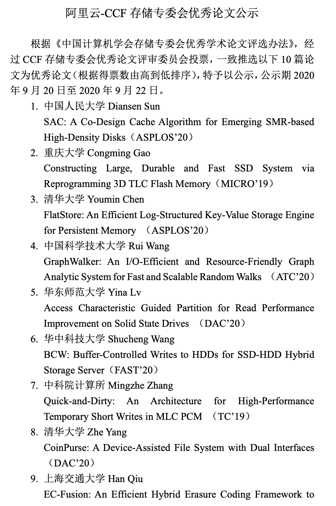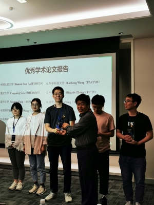 该奖项由阿里云与CCF信息存储技术专委会联合组织,评选过去一年在存储相关领域国际顶级学术会议和期刊发表的十大论文。入选的论文均发表于ASPLOS、ISCA、FAST、MICRO、ATC、DAC、TC等计算机系统结构方面的顶级国际会议和期刊,获奖者来自中国人民大学、清华大学、华中科技大学、中国科学技术大学、中科院计算所、重庆大学、上海交通大学和华东师范大学。孙殿森同学的论文经过学术界和企业专家的投票,得票排名第一。