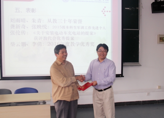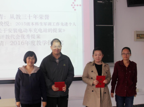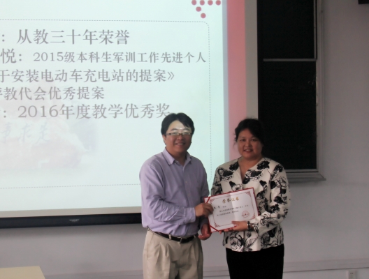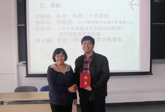 会上,葡京娱乐场官方网站 对2016年部分优秀教师进行表彰。朱青、刘雨晴荣获“从教三十年”荣誉;龚新奇、张映悦荣获2015级本科生军训工作先进个人;张伦传《关于安装电动车充电站》的提案获评教代会优秀提案;柴云鹏、李倩荣获2016年度教学优秀奖。