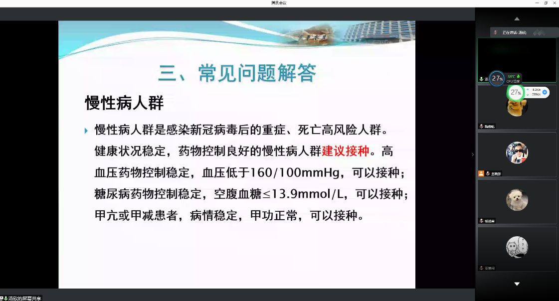 校医院副院长汤欣介绍了新冠疫苗的安全性,并就接种新冠疫苗的一些常见问题进行了解答,鼓励学生消除对疫苗安全性的误解,及时接种疫苗。