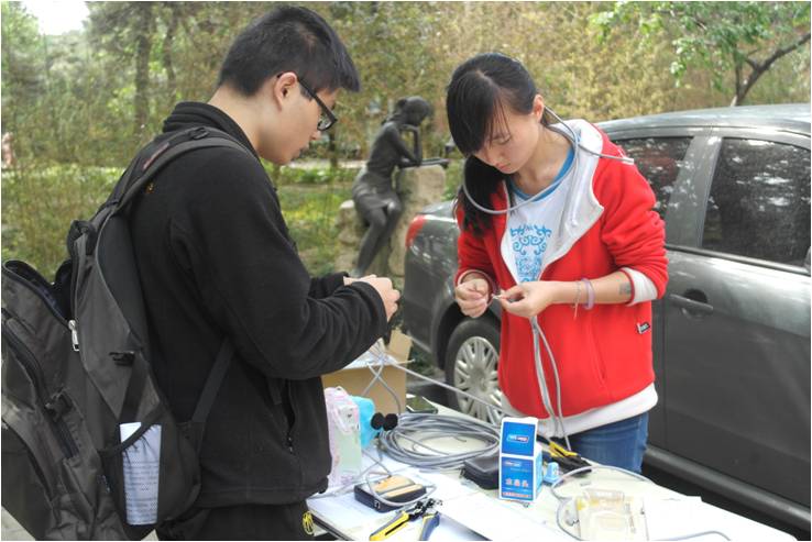 比赛开始前一小时,工作人员在理工配楼门前搭起展台,为面向全校师生进行程序设计作品展示,并同时进行制作网线等有趣的动手环节,活跃了赛前气氛,也展示了葡京娱乐场官方网站 的学科特点。展示现场吸引了多位同学参加,现场气氛热烈。