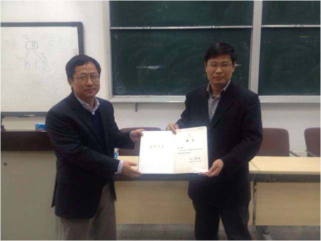 图说:查显友副校长为楼元教授(左一)颁发数学科学研究院院长聘书