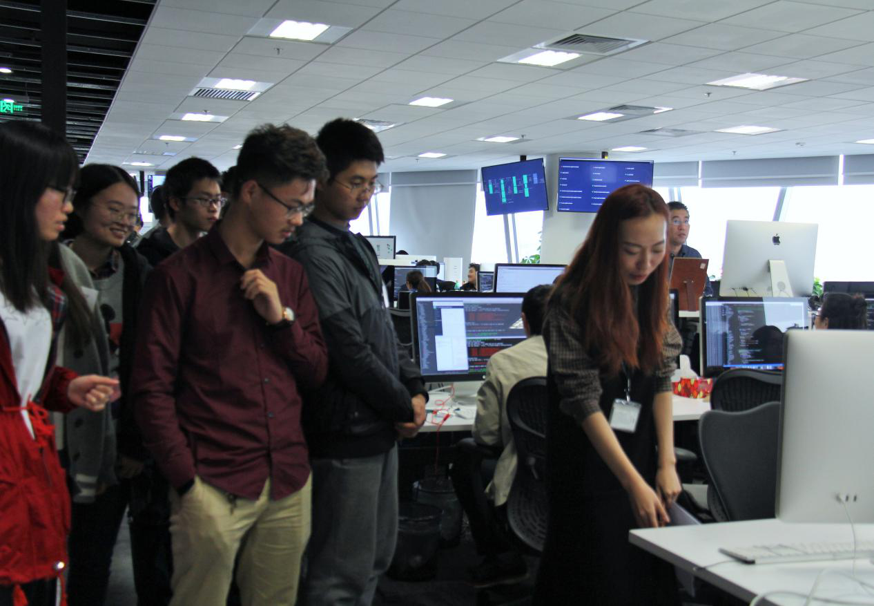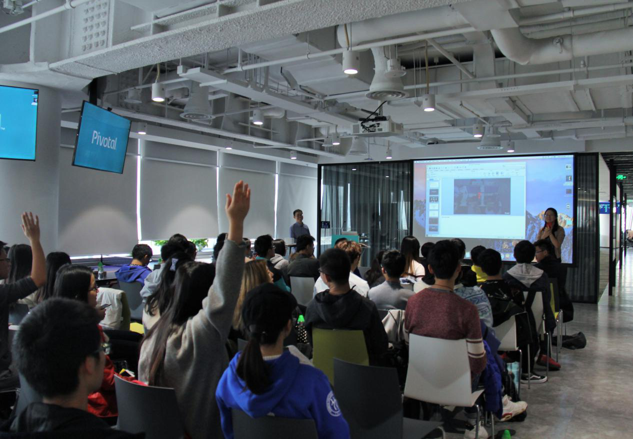 此外,同学们参观了Pivotal公司的工作区域、休闲区等设施,和最新入职的工作人员进行了工作、实习和大学生活等方面的交流。已经工作的师兄师姐表示,在大学的学习中基础非常重要,鼓励大家参与各种项目和竞赛,更重要的是学会灵活使用学科知识等。在关于Pivotal公司和工作相关的互动交流环节中,同学们踊跃提问,气氛活跃。
