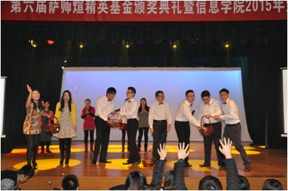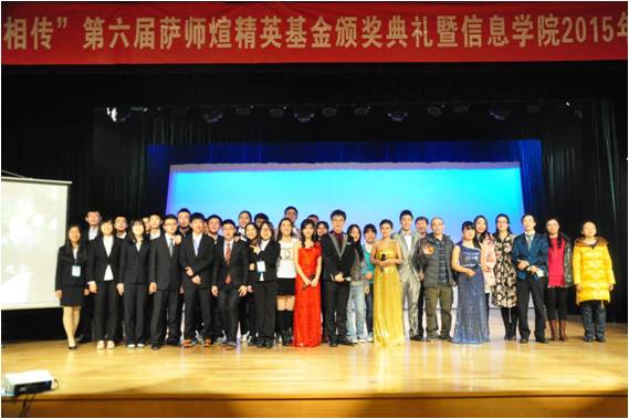 2014年12月27日下午两点,葡京娱乐场官方网站 “信火相传”第六届萨师煊精英基金颁奖典礼暨2015年元旦联欢会在求是楼八百人大教室隆重举行。葡京娱乐场官方网站 院长兼学校理工处处长杜小勇教授,教务处处长数学系龙永红教授,党委书记林颐老师,党委副书记陈红教授,计算机科学与技术系主任石文昌教授,党委委员王伟教授,萨师煊精英基金理事葡京娱乐场官方网站 87级校友周斐先生,人大金仓公司总裁、88级校友任永杰先生等嘉宾出席了此次颁奖典礼。葡京娱乐场官方网站 师生400余人欢聚一堂,共同度过辞旧迎新的美好时光。