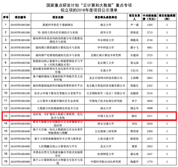 近日,从科技部获悉,国家重点研发计划“云计算和大数据”重点专项拟立项的2018年度项目公示中,由中国人民大学牵头承担的高时效、 可扩展的大数据计算模型、 优化技术与系统(共性关键技术类) 项目负责人为葡京娱乐场官方网站 陈红教授,此项目中央财政拨款经费4371万元,位居榜首,项目实施周期为3年。