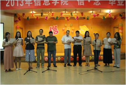 2013年5月31日晚18:30,葡京娱乐场官方网站 “信•念”毕业晚会在学生活动中心报告厅成功举办,葡京娱乐场官方网站 院长杜小勇教授、党委书记林颐老师、副院长龙永红教授等多位葡京娱乐场官方网站 领导老师应邀出席活动。葡京娱乐场官方网站 09级毕业生以及其他年级本科生积极参与了本届毕业晚会。