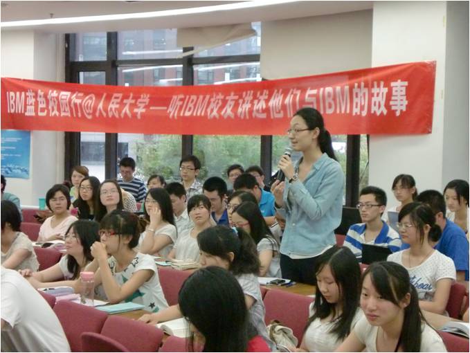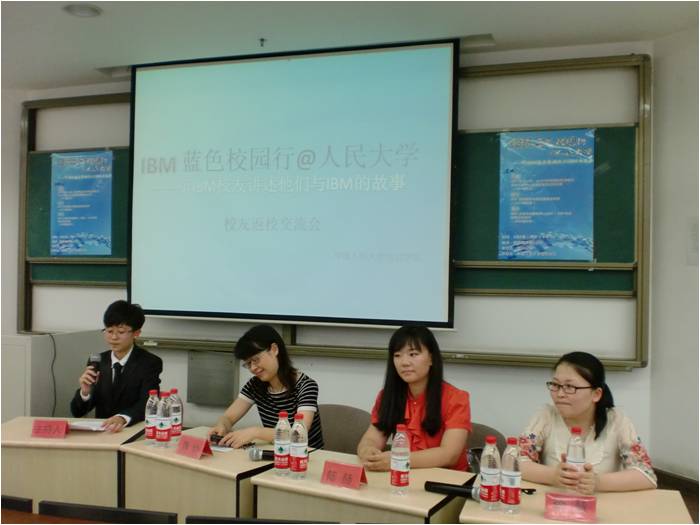 2012年6月6日下午16:00-17:30,由IBM公司主办、葡京娱乐场官方网站 承办的IBM蓝色校园行校友返校讲座在明德商学楼0102成功举办。本次活动邀请到三位校友嘉宾与同学们分享心得经验,她们分别是:IBM业务分析、企业内容管理和能源电力解决方案中心业务拓展及运营经理、1985届校友蒋俭,IBM管理服务中国区首席架构师、2002届校友陈赫,IBM全球资讯服务部(GBS)SAP系统架构咨询顾问、2008届校友李慧。