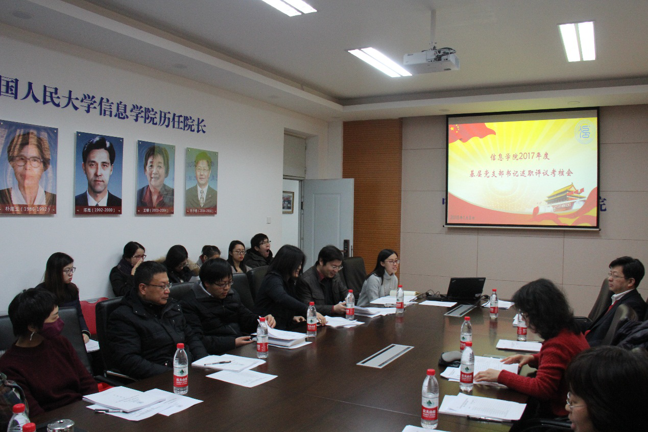 2018年1月8日,葡京娱乐场官方网站 于信息楼257召开了2017年度基层党支部书记抓基层党建述职评议考核会议,葡京娱乐场官方网站 党委书记陈红教授、院长文继荣教授、理工处处长兼党委委员杜小勇教授,副院长兼党委委员左美云教授、柯媛元教授、副院长李翠平教授、党委副书记张国富老师,及其他党委委员、葡京娱乐场官方网站 全体教工及学生党支部书记参加此次会议。
