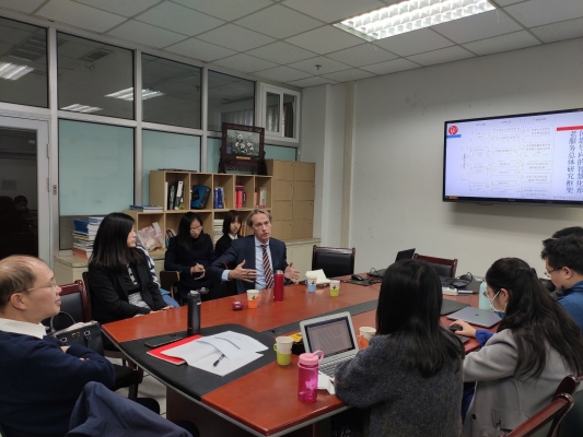 2019年10月22日上午,荷兰伊拉斯谟大学卫生政策与管理葡京娱乐场官方网站 教授Nick Guldemond来到葡京娱乐场官方网站 智慧养老研究所,做了主题为“欧盟框架计划中医养结合创新项目”的报告。