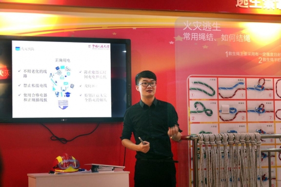本次培训由保卫处防火科科员朱小龙老师担任主讲人,朱老师为到场老师们讲解了该如何应对生活中各种突发事件。首先,他就如何应对火灾作了详细的讲解,从燃烧条件,火灾原因,扑救流程,逃生注意事项等方面进行介绍,并着重强调了拨打火警报告火情时的细节以及如何正确扑救并逃生,同时播放了发生在我校的一起火险事件视频作为案例。随后,朱老师讲解并示范了几种使用绳索逃生的方法。在这一过程中,所有在场老师们热情积极地跟随主讲人动手学习了如何正确使用绳索逃生,将本次知识讲座推向高潮。
