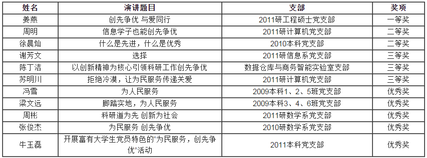 下午3:00比赛正式开始,林颐老师首先讲话,他指出比赛只是一种形式,最终的目的是交流心得,领悟精神,将为民服务的宗旨落实到行动上。随后,从各支部选拔出来的11名参赛选手围绕“创先争优”这一主题一一做了慷慨激昂的演讲。选手们热情洋溢的表情、生动鲜活的语言,充分演绎了各级党支部及优秀党员同志践行“创先争优”主题的风采,展现了当代大学生党员的精神风貌和人格魅力。在《创先争优,与爱同行》、《脚踏实地,为人民服务》、《科研道为先,创新为社会》等演讲中,既有慷慨激昂的陈述,也有感人至深的故事,给观众们带来了一次次深刻的心灵洗礼。最后,校学生处文书锋副处长对演讲比赛进行了总结与点评,对全院参与该演讲比赛的高度积极性表示了充分的肯定和支持,也对选手们声情并茂的演讲给予了高度的赞扬。经过激烈的角逐,来自2011研工程硕士党支部的姜燕同学获得了一等奖的好成绩。此次演讲比赛也圆满落下帷幕。