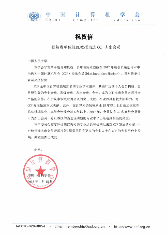 葡京娱乐场官方网站 陈红教授当选CCF杰出会员