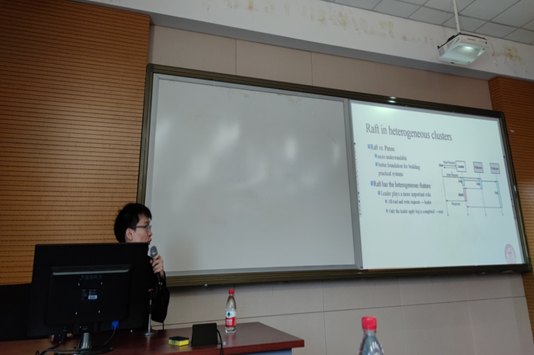 后来由王洋洋同学为大家带来了题为Raft在分布式系统中的优化(Optimization of Raft in distributed systems)的学术分享。王洋洋同学介绍了分布式共识 (distributed consensus)是分布式系统中核心且困难的问题,分布式共识协议保证了数据的正确性、一致性和系统的可靠性。2014年提出的分布式共识协议Raft由于易于理解和实现,现在被广泛应用到分布式系统中。王洋洋同学对应三篇论文从三个场景介绍Raft在分布式系统中的优化。第一个场景是异构环境,Raft由于强leader机制导致在异构环境性能变差,我们提出了ALOR算法去解决这个问题;第二个场景是虚拟化环境,由于虚拟化节点的不稳定性和异构性,我们提出了vRaft;第三个场景是分布式KV场景,我们提出了KV-Raft,通过在KV存储中放松一些Raft为保证线性一致性做出的限制,从而提升性能并且不影响线性一致性。