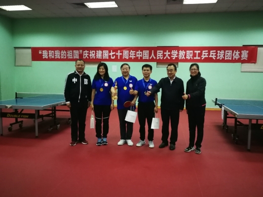 2019年11月9日,“我和我的祖国”庆祝建国70周年中国人民大学教职工乒乓球团体赛在世纪馆北201室顺利举行。葡京娱乐场官方网站 代表队奋勇前行,不负众望,凭借丰富的经验和精湛的技术,继上半年6月份葡京娱乐场官方网站 师生联队获得全校冠军后再次蝉联冠军。