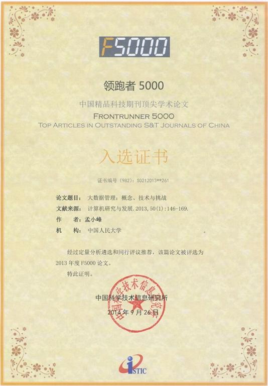 最近,中国科学技术信息研究所公布2013年度“领跑者5000—中国精品科技期刊顶尖学术论文”入选名单,孟小峰、慈祥2013年发表在《计算机研究与发展》上的论文“大数据管理:概念、技术与挑战”入选。为了促进我国精品期刊品牌价值,促进学术交流和知识传播,中国科学技术信息研究所开展了“精品期刊顶尖学术论文平台––领跑者5000”(Frontrunner 5000, F5000,f5000.istic.ac.cn)项目的研究和平台建设。该项目入选论文的第一个条件是进入核心期刊各学科被引次数前1%的论文,第二个条件是精品期刊的论文。 国家科技部自2000年开始,先后立项研究"中国精品科技期刊战略研究"和"中国精品科技期刊服务与保障系统"课题,并于2008年,2011年,2013年公布了三届"中国精品科技期刊"的评选结果。入选文章在F5000平台上线,并于SCI数据库在同一平台内实现文献链接和国际引文检索,在更大范围内向世界科技同行展示和推广我国最重要的科研成果。 孟小峰教授论文发表之后引起了学术界的广泛关注。截止2014年10月,短短一年多的时间,该文在国内最权威的中文数据库——中国知网已获得超过32000次的下载,引用次数达到222次。无论是下载量还是引用次数都据2013年整个信息科技领域新发表论文之首。