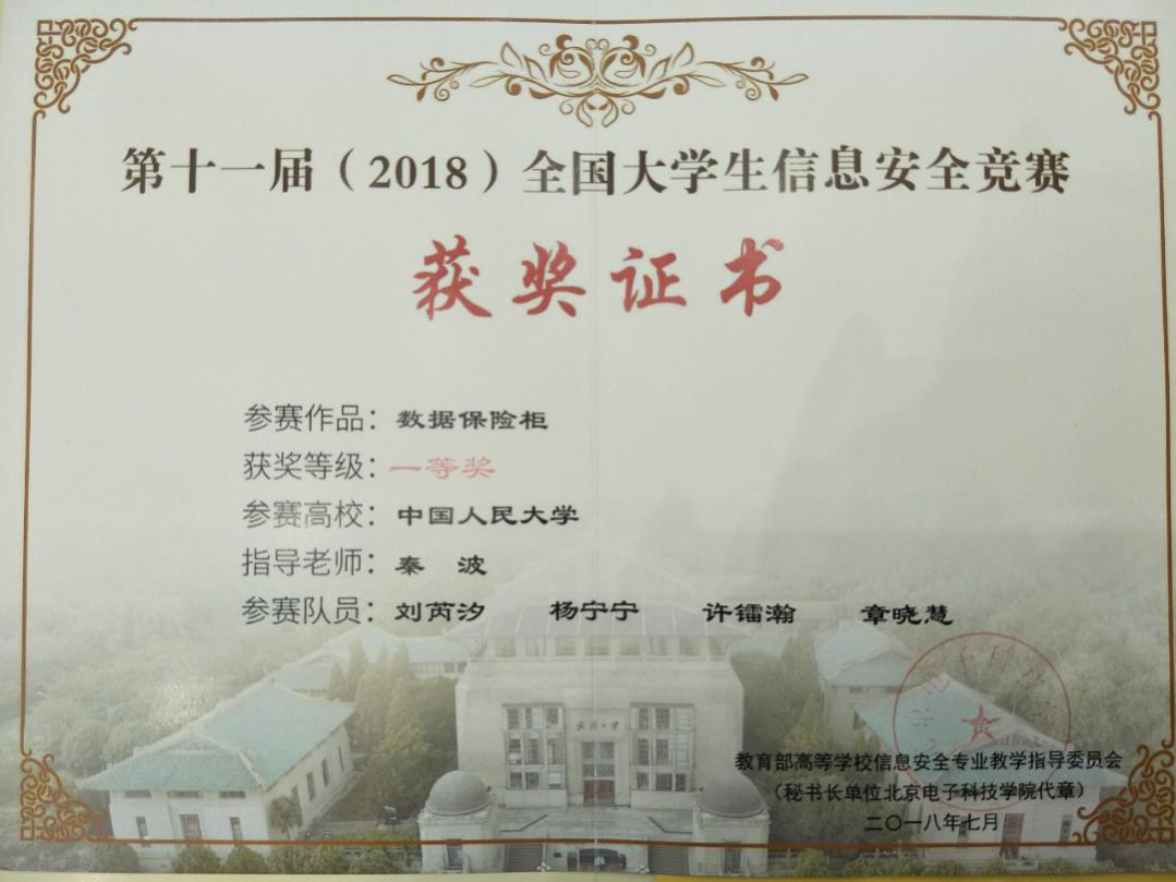 由教育部信息安全专业教学指导委员会主办的第十一届全国大学生信息安全竞赛作品赛,于2018年7月29日在武汉大学落下帷幕。我校共有三支队伍参赛,获得两项全国一等奖、一项全国二等奖的优异成绩。
