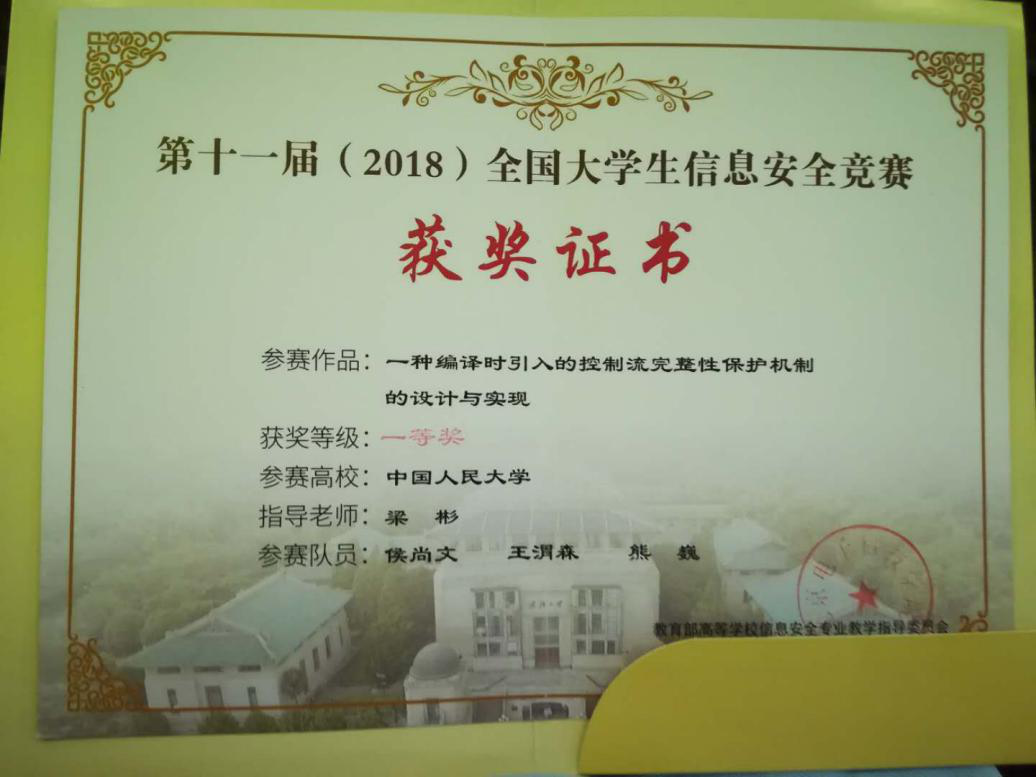 另一获得一等奖作品为《一种编译时引入的控制流完整性保护机制的设计与实现》,该作品葡京娱乐场官方网站 由侯尚文、熊巍、王渭森三位同学完成,指导教师为葡京娱乐场官方网站 信息安全专业教师梁彬教授。该作品实现了一种控制流完整性保护机制,通过在gcc编译器层面完成特征指令与检测代码的插桩,让特征指令作为基本块的入口标识,成为程序运行中正常转移的合法性检测标准,使得绝大部分想要通过间接跳转与间接调用进行攻击的异常行为被强制中止,使程序与用户免受非授权访问的危害。