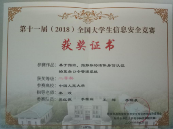 另一组的作品为《基于指纹、指静脉的活体身份认证的复杂口令管理系统》,获得了二等奖。该作品由葡京娱乐场官方网站 吴红薇、王辉、李瑞晨、李雅娴四位同学完成,指导教师为葡京娱乐场官方网站 信息安全专业教师秦波副教授。该作品针对密钥管理的痛点问题,提出了自己的解决方案。在实现电子身份与物理身份紧密绑定的同时,帮助用户管理复杂口令。用户仅需提供其生物特征与简单口令就可以方便、安全地管理诸多复杂长口令。本系统引入生物特征密码技术,将生物特征与传统密码学相结合,利用生物特征的独特性、不易伪造、无需记忆等优势,有效弥补了上述传统密码学的缺陷。其次,本系统应用了当今发展最成熟的生物特征密钥绑定技术——模糊金库模型,将加密后的用户指纹、指静脉特征与用户复杂长口令经一系列运算和混合处理,加入噪音点,生成模糊金库。因此,该系统在安全隐藏用户的复杂长口令信息的同时,有效保护了用户生物特征,并能抵御多数据库比对攻击,安全性很高。