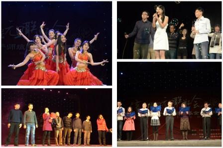 (图说:左上图为肚皮舞《simarik》,右上图为辩论队演唱歌曲《爱因为在心中》,