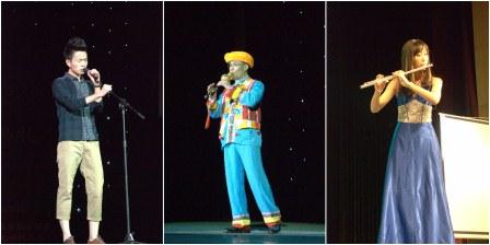 (图说:左至右为学生歌曲串烧,葫芦丝演奏《月光下的凤尾竹》,乐器连奏《乐曼探戈》)