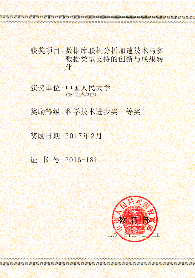 近日,教育部科技发展中心正式公布了2016年度高等学校科学研究优秀成果奖(科学技术)的授奖项目,葡京娱乐场官方网站 杜小勇、陈红、张孝、张延松、李翠平、陆嘉恒、王珊申报的《数据库联机分析加速技术与多数据类型支持的创新与成果转化》项目,获评教育部2016年科技进步一等奖。