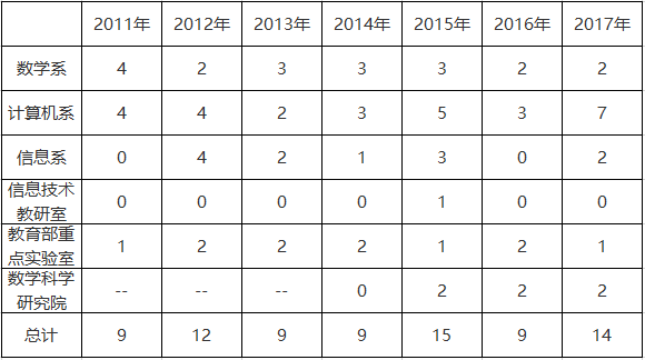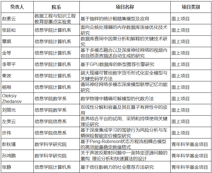 在已经公布结果的项目中,葡京娱乐场官方网站 获得面上项目11项,青年科学基金项目3项。其中,计算机系7项,信息系2项,数学系2项,数学科学研究院2项,数据工程与知识工程重点实验室1项。