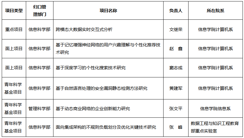 在2018年度国家自然科学基金中,葡京娱乐场官方网站 文继荣教授的《跨模态大数据实时交互式分析》项目获得重点项目资助。此项目属于科学基金研究项目系列和人才资助体系中非常重要的资助类型,申请难度明显高于一般项目。获得此类项目资助也是衡量一所高校科研实力的重要指标,这是我校今年获得的唯一1项重点项目。葡京娱乐场官方网站 另获得2项面上项目分别是计算机系赵鑫副教授的《基于记忆增强神经网络的用户兴趣理解与个性化推荐技术研究》、计算机系窦志成教授的《基于深度学习的个性化搜索技术研究》;以及3项青年科学基金项目分别是计算机系黄建军老师的《基于自然语言处理的安全漏洞静态检测方法研究》、信息系张文平老师的《基于动态商业网络的企业创新能力研究》、数据工程与知识工程重点实验室张峰博士的《面向集成架构的不规则负载划分及优化关键技术研究》项目。
